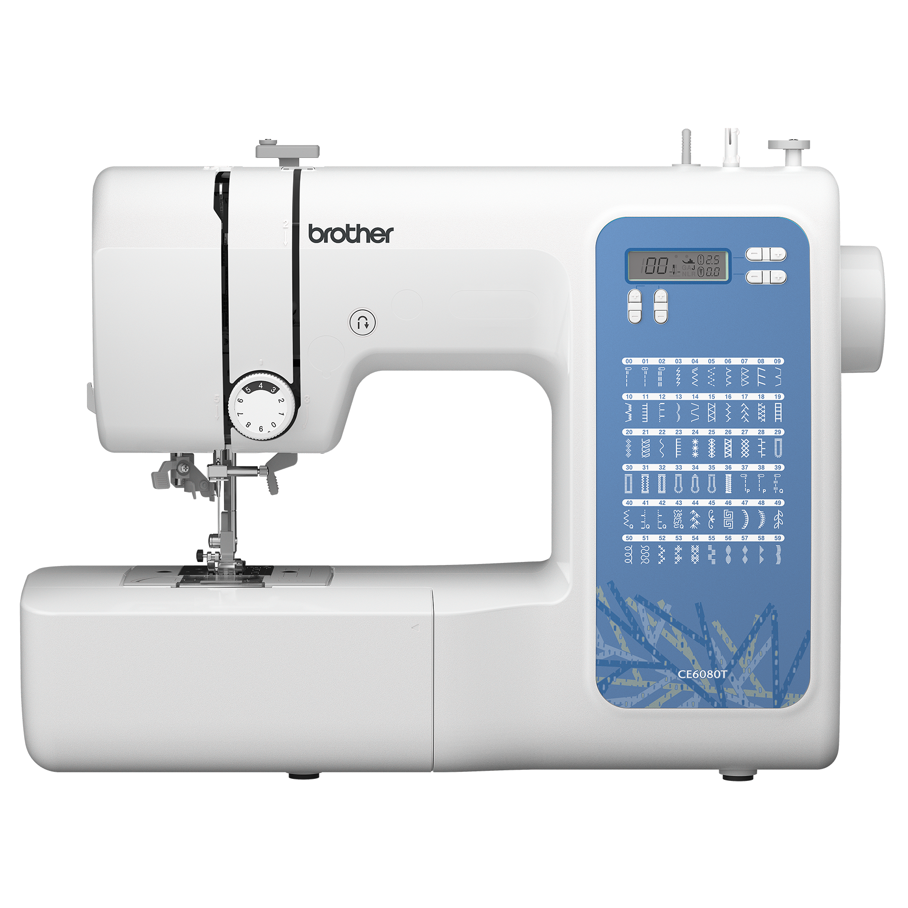 Indulge your inner designer with the wide range of professional features found in the Brother CE6080T. This robust computerized sewing machine features a durable aluminum frame and boasts 60 built-in stitches, 87 stitch functions and 5 sizes of auto-size buttonholes. Its bright LCD display screen with computerized stitch selection makes it simple to choose from a huge variety of decorative, quilting or heirloom stitches to embellish your wardrobe. An exceptional feed system lets you enjoy virtually effortless sewing on denim, tweed, and other thick fabrics. This machine includes a wide table for quilting and larger projects and 7 sewing feet: zig-zag, blind stitch, button sewing, buttonhole, monogramming, overcasting and zipper. With an advanced needle threading system that makes threading easy and quick-set bobbin and super bright LED-lit work area, the CE6080T will help you turn clothing into instant runway style sensations!
