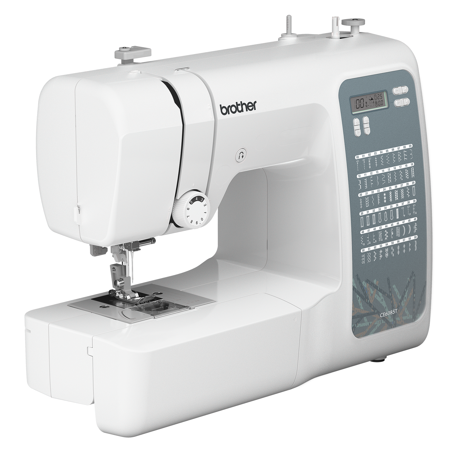 Indulge your inner designer with the wide range of professional features found in the Brother CE6085T. This robust computerized sewing machine features a durable aluminum frame and boasts 60 built-in stitches, 87 stitch functions and 5 sizes of auto-size buttonholes. Its bright LCD display screen with computerized stitch selection makes it simple to choose from a huge variety of decorative, quilting or heirloom stitches to embellish your wardrobe. An exceptional feed system lets you enjoy virtually effortless sewing on denim, tweed, and other thick fabrics. This machine offers incredible value with a variety of bonus accessories, including a wide table for quilting and larger projects and 10 sewing feet: zig-zag, blind stitch, button sewing, buttonhole, monogramming, overcasting, zipper, 1/4 inch piercing, quilting and walking. With an advanced needle threading system that makes threading easy, quick-set bobbin and super bright LED-lit work area, the CE6085T will help you turn clothing into instant runway style sensations!
