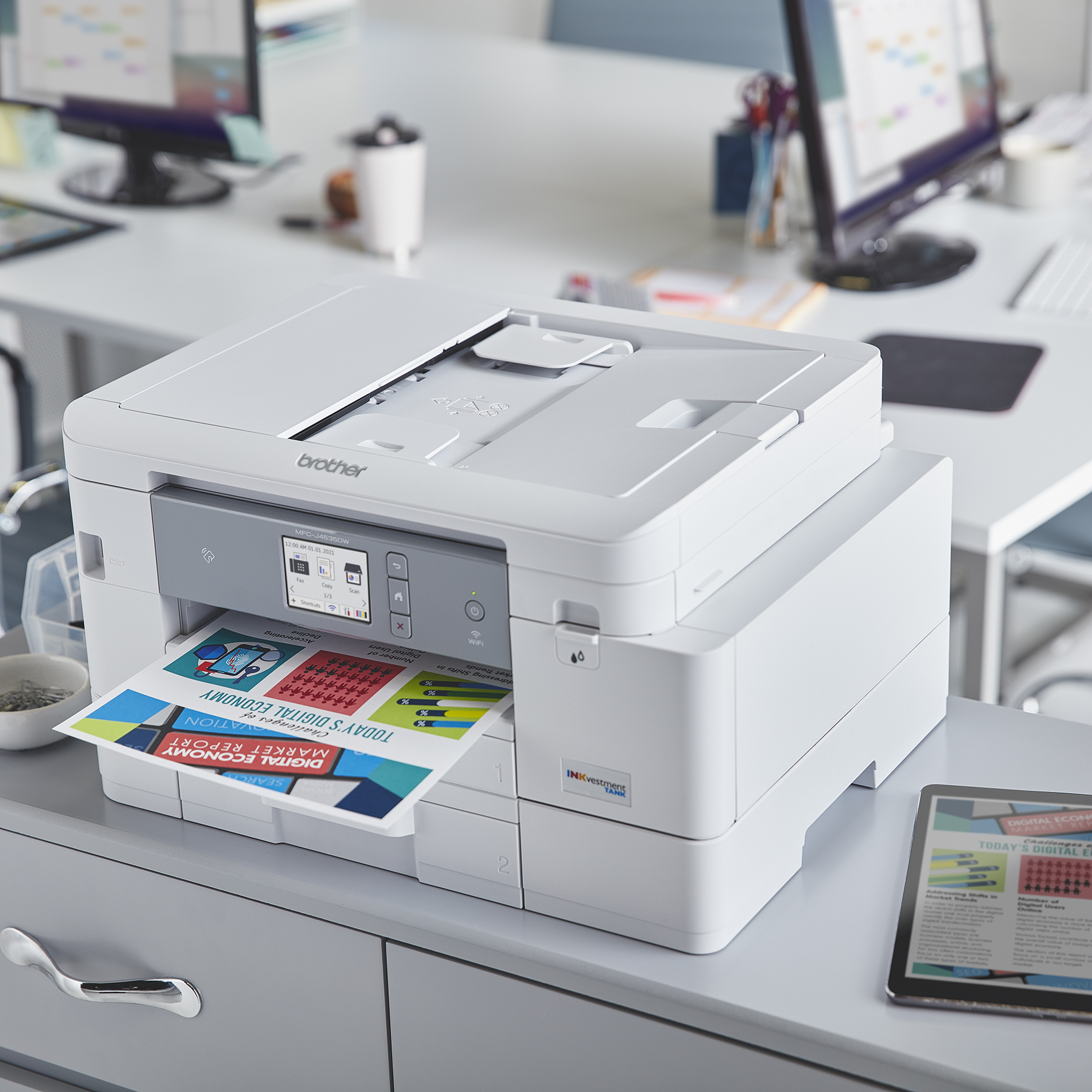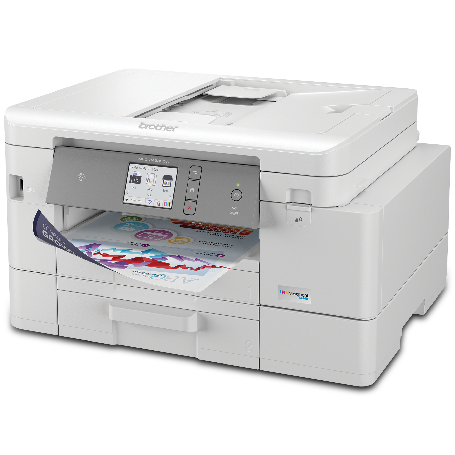 The MFC-J4535DW INKvestment Tank all-in-one colour inkjet printer is ideal for home and small office use. Its reengineered high-capacity in-box ink cartridges provide up to 1-year of uninterrupted printing. Print and copy from your mobile device plus scan and fax. See full product description