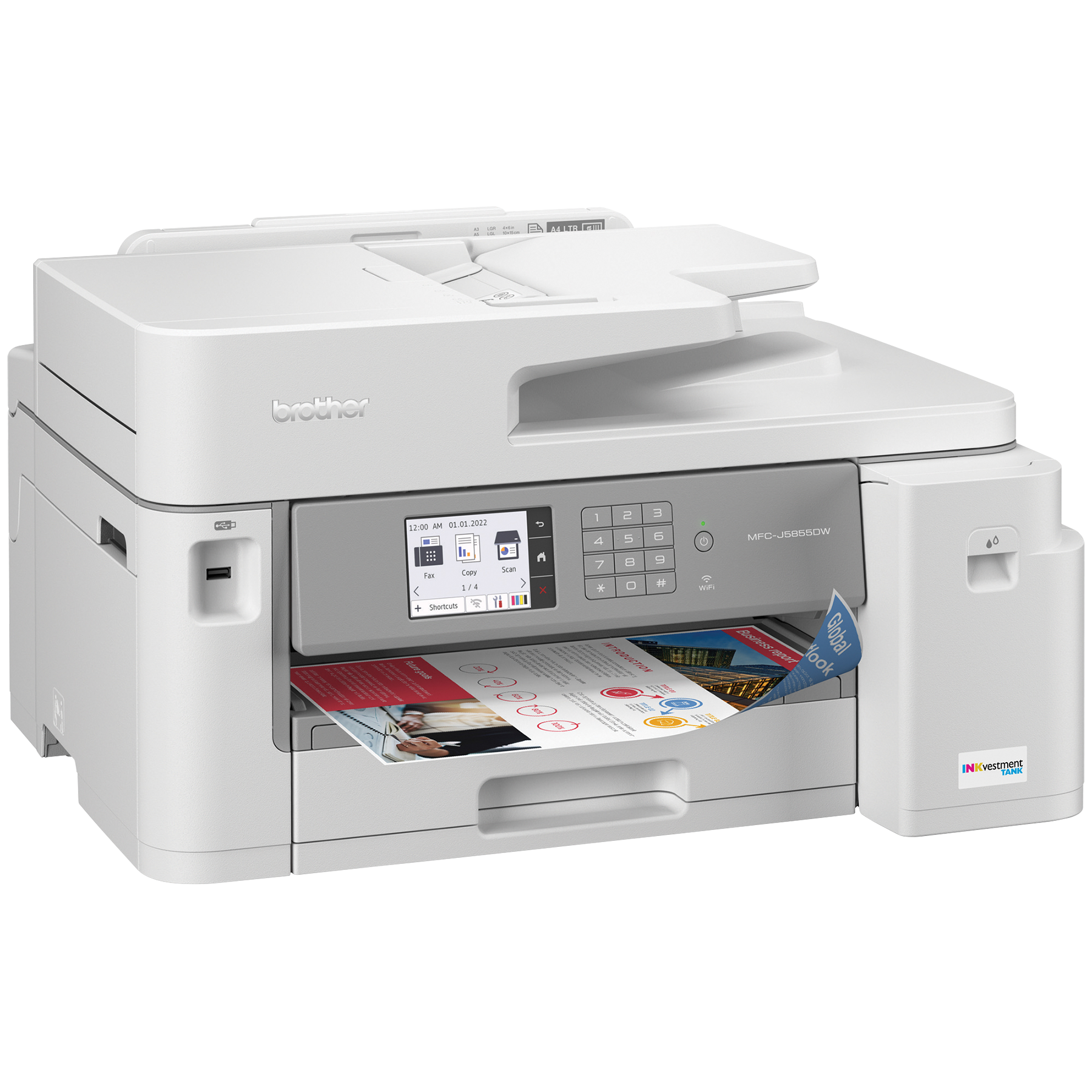 The Brother MFC-J5855DW INKvestment Tank colour inkjet all-in-one printer delivers economical, reliable, professional-quality printing for home or work with up to 1 year of ink in-box. Whether you re printing personal documents, school reports or large presentations, you can count on quick printing with vibrant colours and sharp text. Flexible connectivity includes built-in dual band wireless (2.4GHz/5GHz), Wi-Fi Direct®, Ethernet, local USB connection, and print & scan on the go with the Brother Mobile Connect App so you can work where and when you want. Print, copy, scan, and fax functions are easy to manage from a computer, mobile device, or using the intuitive 3.5 LCD colour touchscreen. Eco-friendly features like EPEAT® and ENERGY STAR® certification, Eco Mode and Ink Save Mode that help reduce power and ink use, and default duplex printing that saves paper and money help you do your part for the planet. Rest easy knowing that advanced triple layer security helps safeguard sensitive documents while printing. Built to last and designed for exceptional ease of use right out of the box, this Brother INKvestment Tank printer is a smart choice for your home office or small business.