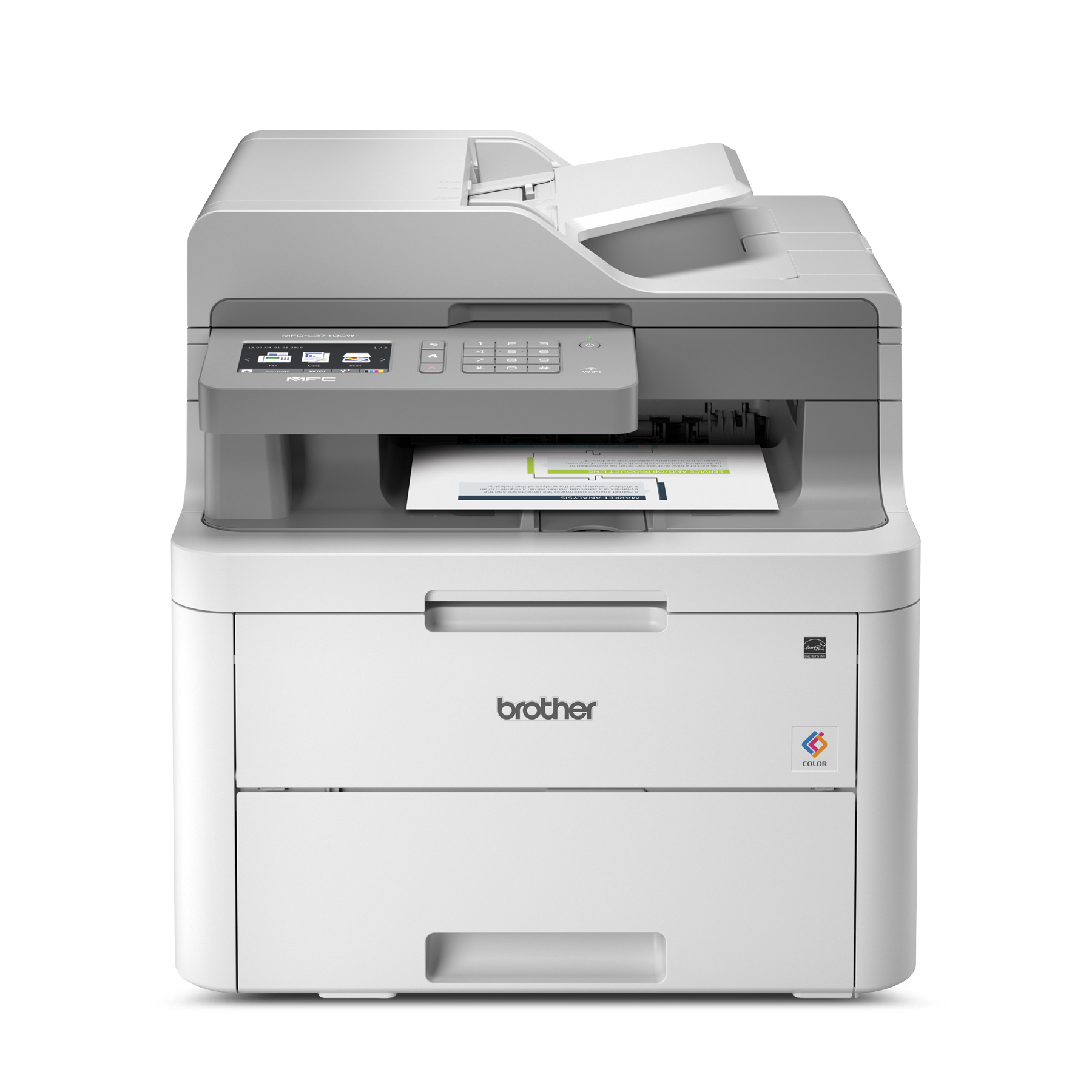 Compact and reliable, the Brother MFC-L3710CW Digital Colour All-in-One Multifunction Centre offers fast print speeds up to 19 pages per minute and is an ideal choice for home and small offices that want to print, copy, scan and fax quickly and efficiently. With an up to 50-sheet automatic document feeder, it enables multi-page copying, scanning and faxing while its manual feed slot accommodates varied printing needs and can handle a variety of paper types and sizes including card stock, envelopes and more. The 250-sheet capacity adjustable paper tray further helps improve efficiency with fewer refills and handles letter or legal sized paper. Connect with versatile options including built-in wireless, or USB interfaces and print wirelessly from mobile devices. Save time by creating custom shortcuts on the 3.7 colour touchscreen, which also enables you to print-from and scan-to popular cloud apps including Dropbox, Google DriveTM, Evernote, OneNote and more and save money by using Brother Genuine high-yield replacement toner cartridges that help lower printing costs. Comes with a 1-year limited warranty and free online or live chat support for the life of your product.