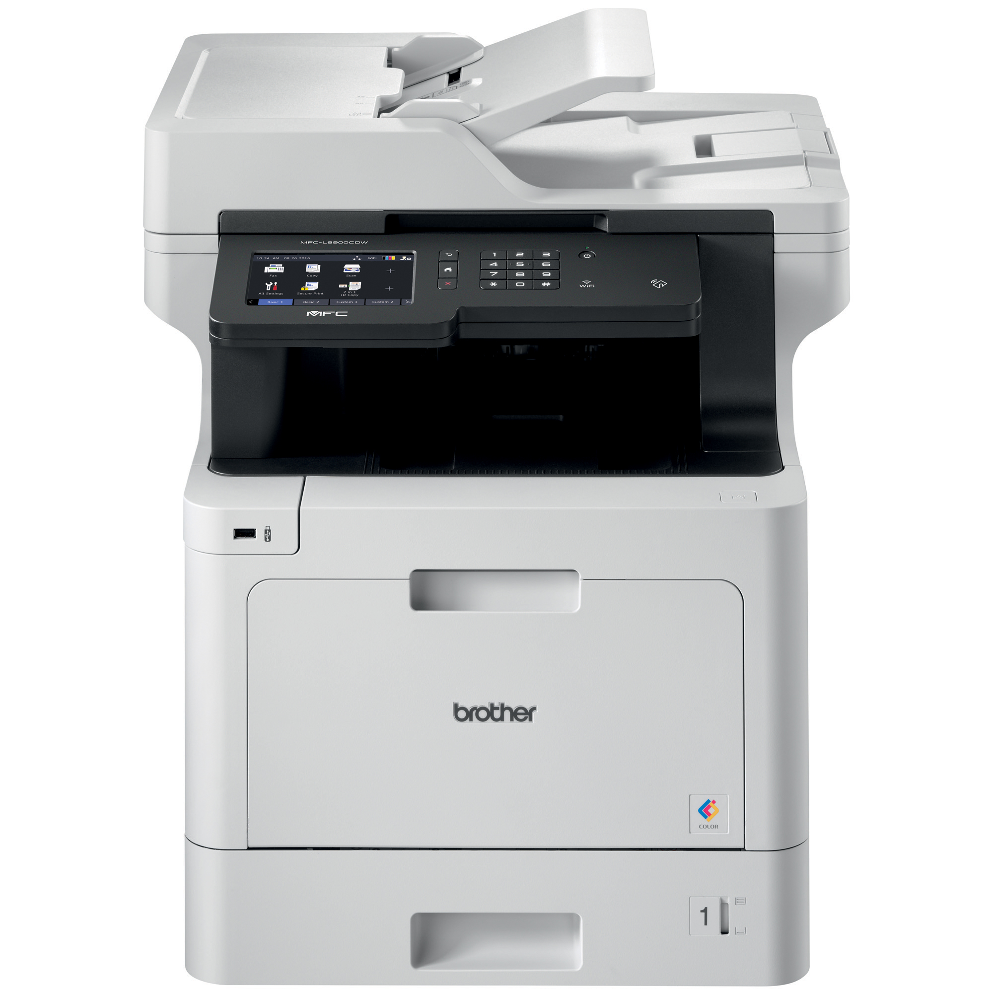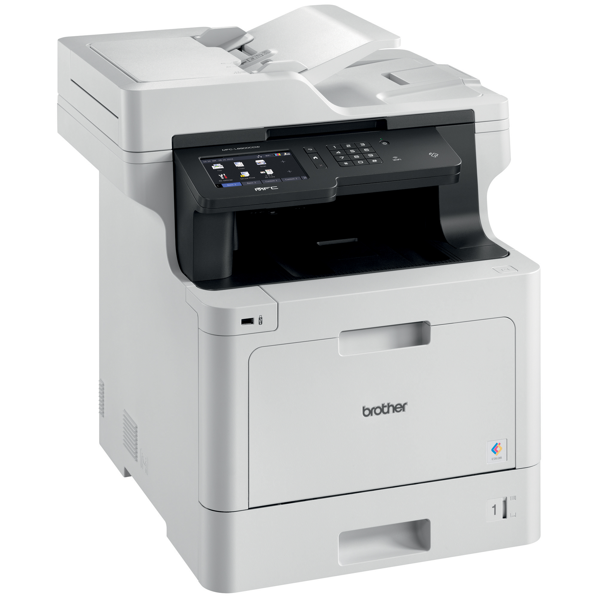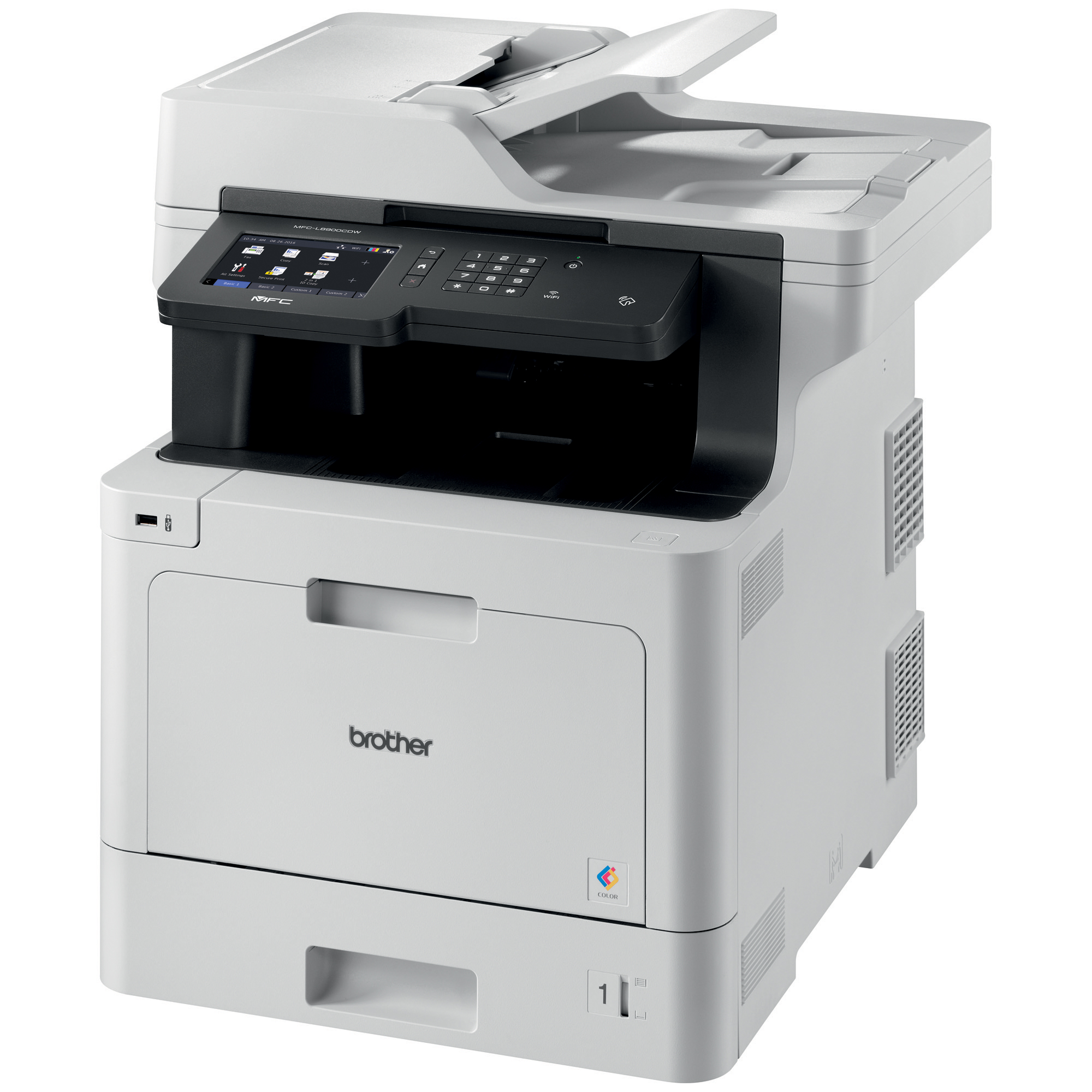 The Brother MFC-L8930CDW colour laser All-in-One is ideal for offices and small workgroups with higher print volumes. Brother Genuine super high-yield 6,500-page replacement toner cartridges (approximate yield based on ISO/IEC 19798) deliver low cost output. Print/copy up to 33 pages per minute in black and colour. Gigabit Ethernet/wireless networking. 70-page capacity auto document feeder with two-sided scanning at up to 58ipm; legal-size scan glass. Automatic duplex printing. Print from/scan to mobile devices over a wireless network. Scan to a variety of destinations. 5.0" colour Touchscreen display with customizable shortcuts. Advanced security features for network user authentication plus device access restriction.