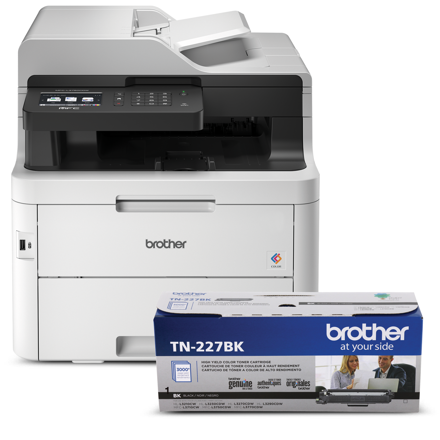 This bundle includes a reliable refurbished Brother MFCL3750CW Digital Colour All-in-One Multifunction, 1 set of Starter Toner Cartridges (BK/C/M/Y) (1,000 pages each) and a TN227BK high-yield black laser toner cartridge (approx. 3,000 pages total) and is an ideal choice for home and small offices that want to fax, copy and print at speeds up to 25 ppm and scan at speeds up to 29 ipm black and 22 ipm colour. With an up to 50-sheet automatic document feeder, it enables multi-page copying, scanning and faxing while its manual feed slot accommodates varied printing needs and can handle a variety of paper types and sizes including card stock, envelopes and more. The 250-sheet capacity adjustable paper tray further helps improve efficiency with fewer refills and handles letter or legal sized paper. Connect with versatile options including built-in wireless, or USB interfaces and print wirelessly from mobile devices. Save time by creating custom shortcuts on the 3.7 colour touchscreen, which also enables you to print-from and scan-to popular cloud apps including Dropbox, Google Drive , Evernote, OneNote and more and save money by using Brother Genuine high-yield replacement toner cartridges that help lower printing costs. Comes with a 1-year limited warranty and free online or support for the life of your product.