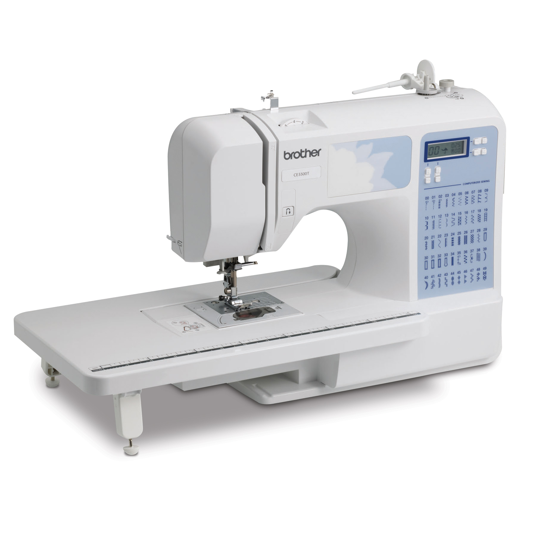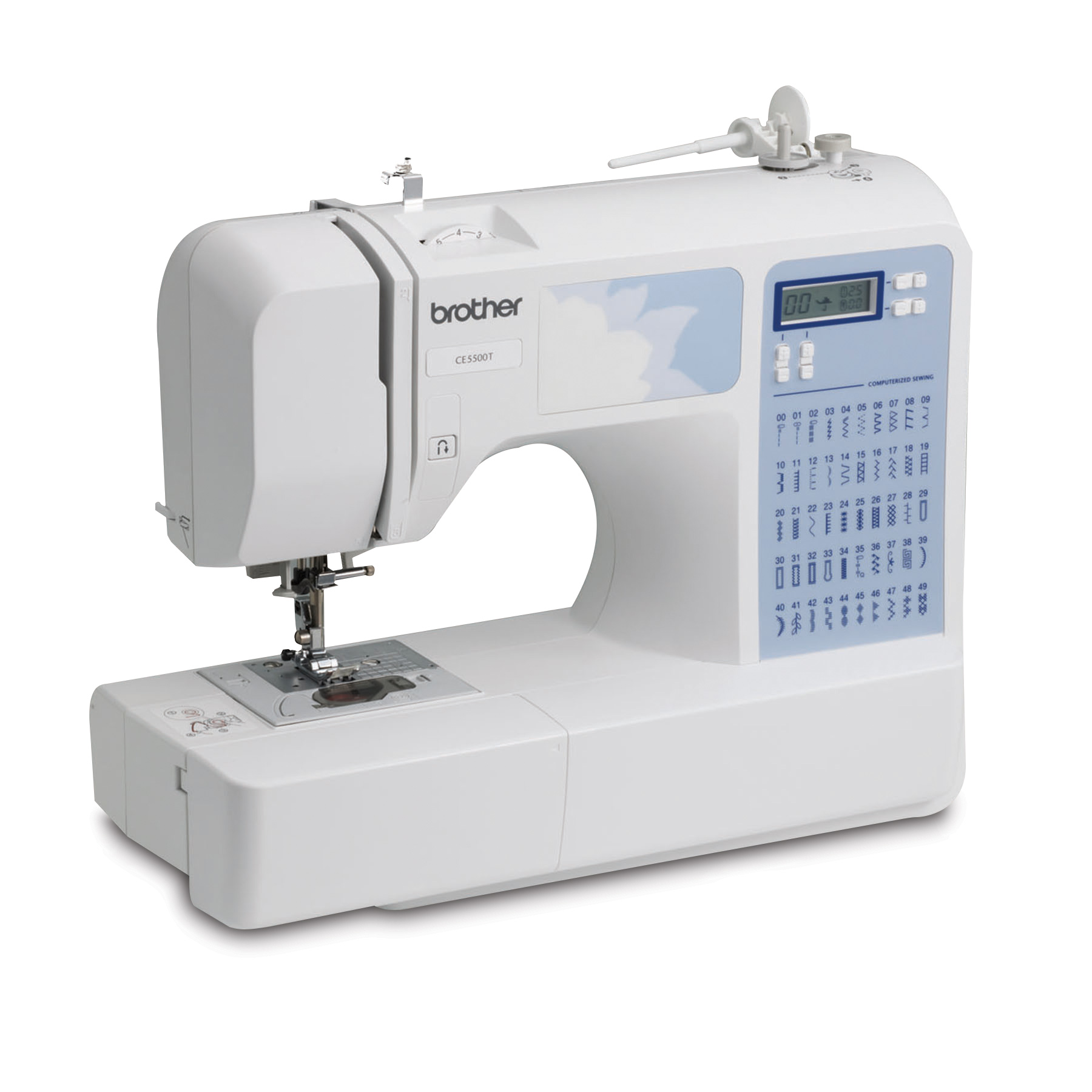 Treat the Designer in you to a range of professional features in the CE5500T, a computerized sewing machine with 50 built-in stitches, 87 stitch functions and 5 sizes of auto-size buttonholes. Use the bright LCD display screen with computerized stitch selection to choose from a range of decorative, quilting or heirloom stitches to embellish your wardrobe. Experience virtually effortless sewing on denim, tweed, and other thick fabrics with the exceptional feed system. Complete with an advanced needle threading system that makes threading easy, fast bobbin winding system, Quick-Set bobbin and super bright LED-lit work area, the CE5500T will help you turn clothing into runway style creations in no time!