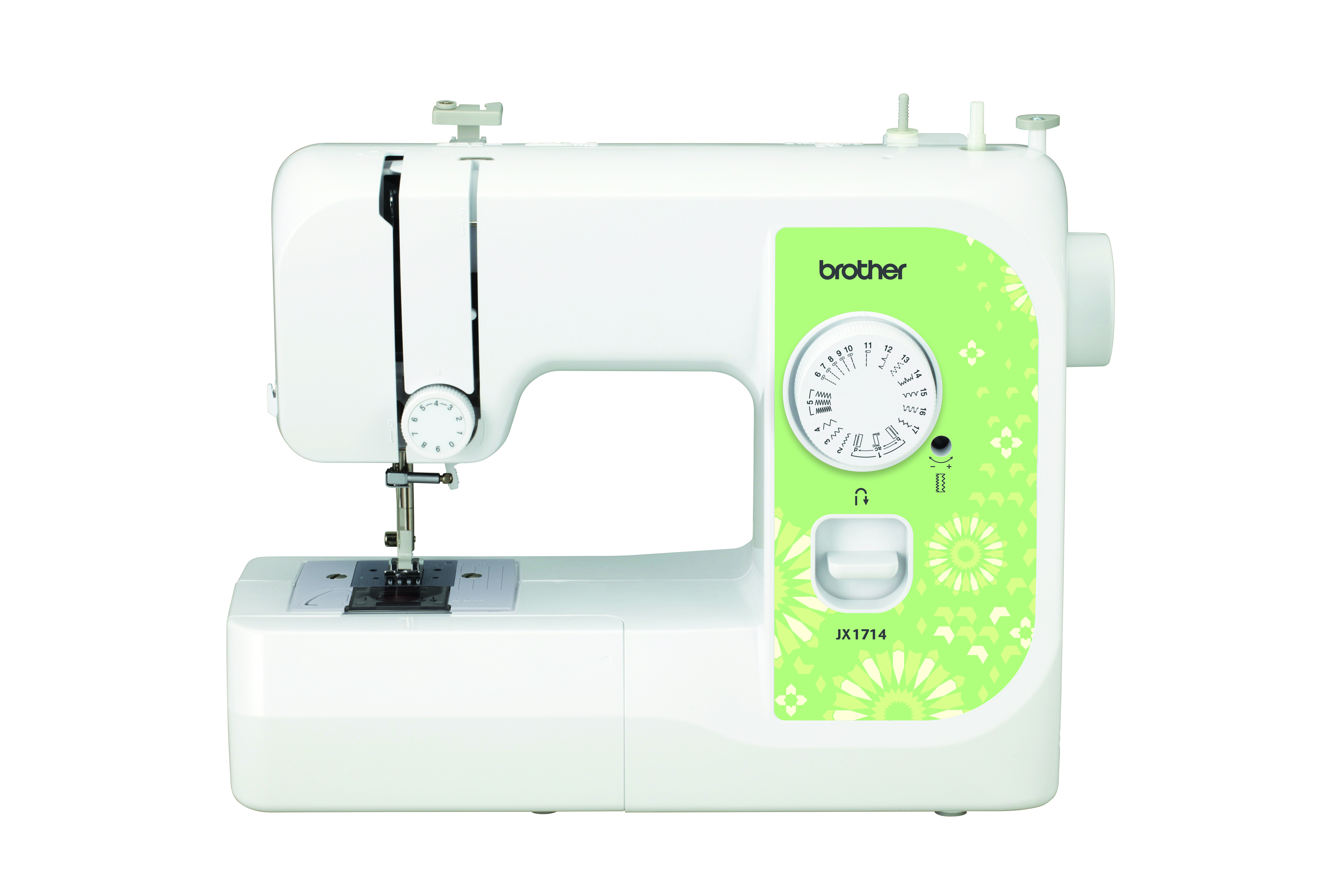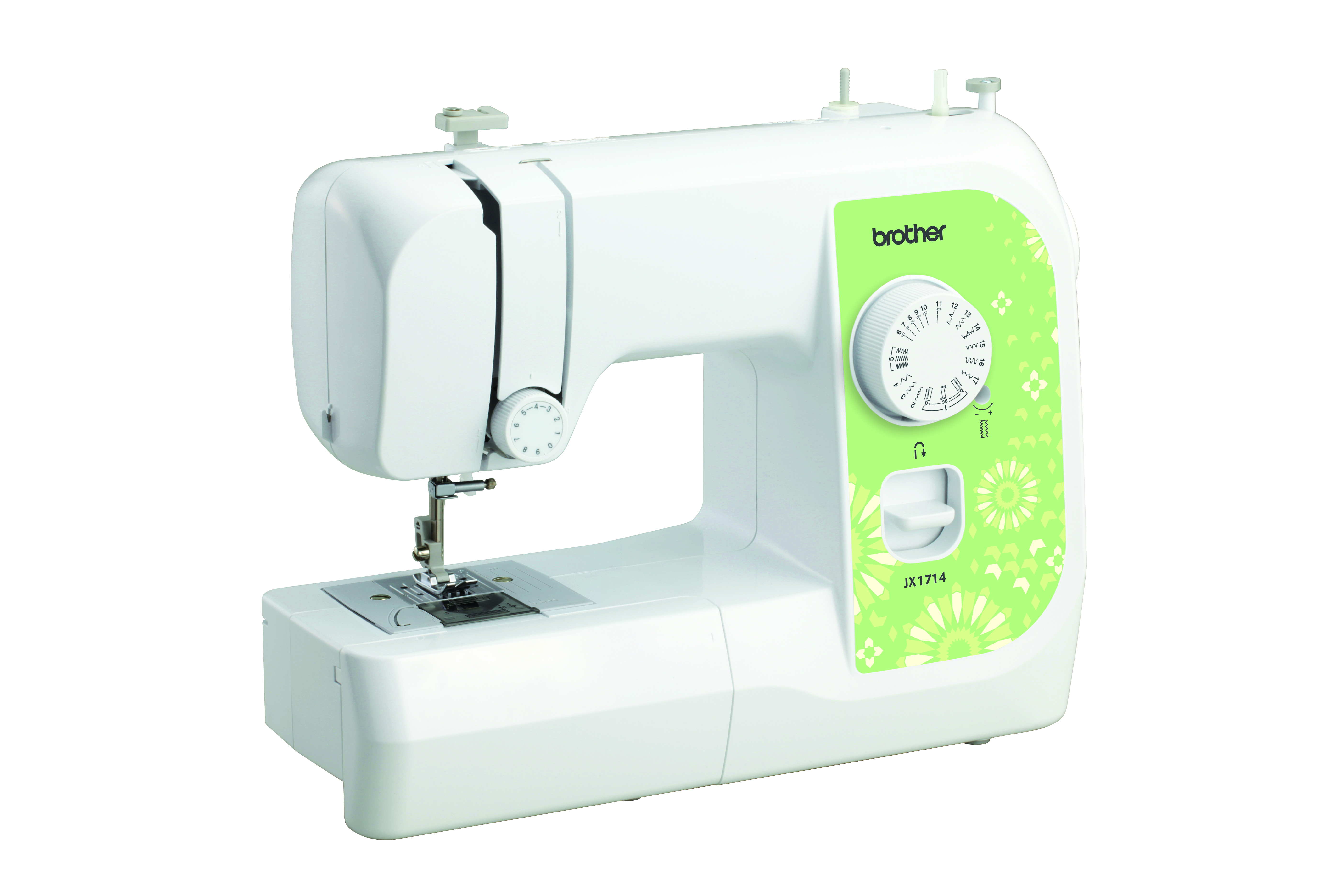 Lightweight, compact and affordable, the JX1714 offers 17 easy-to-select utility and decorative stitches and loads of features for everyday sewing and mending. The tension control dial and reverse sewing lever deliver sewing excellence at your fingertips. Four included presser feet let you insert zippers, create buttonholes, sew buttons and handle general sewing. Also included are a Quick-Set drop-in top bobbin, clear-view bobbin cover and bobbin, automatic bobbin winding system, and a free arm for sewing cuffs and sleeves. Its included twin needle, extra spool pin, darning plate and how-to DVD add up to even more value!
