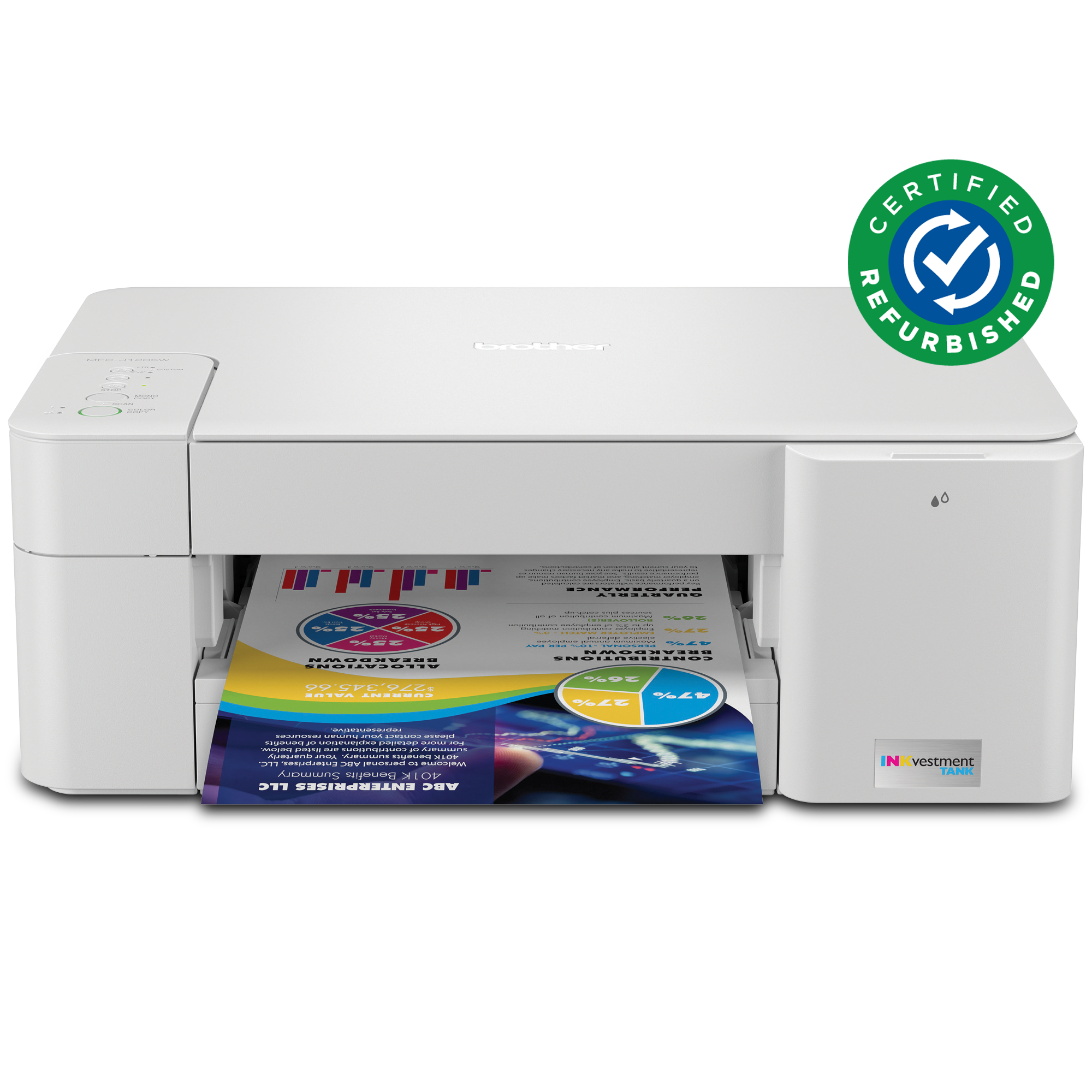 The MFC-J1205W Refurbished INKvestment Tank multifunction colour inkjet printer is ideal for home and home office use. Its reengineered high-capacity in-box ink cartridges provide up to 1 year of uninterrupted printing. Enjoy printing and copying from your mobile device, plus scanning. See full product description