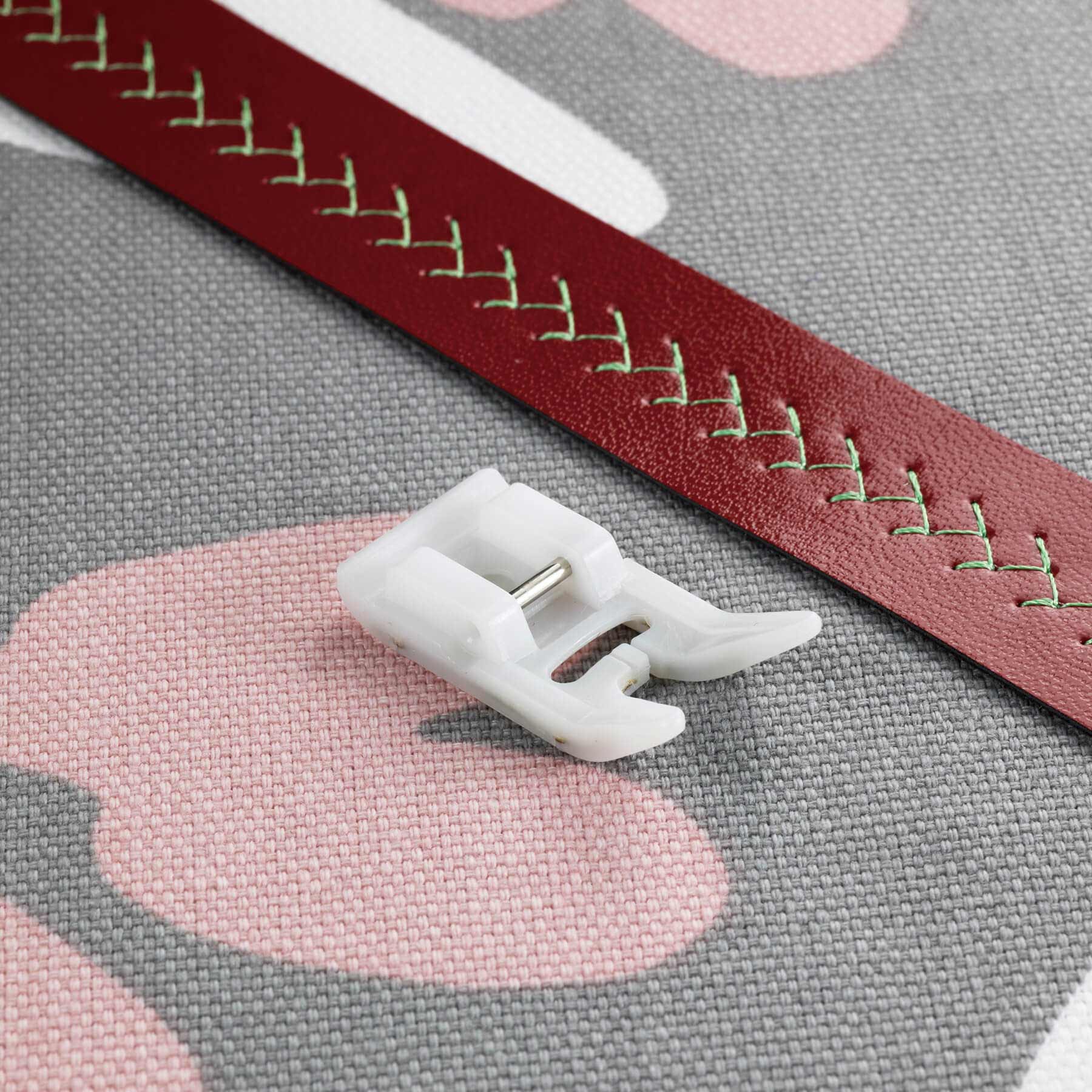 Genuine Brother® Accessory. Designed for consistent feeding with fabric such as leather, vinyl and other novelty fabrics. This non-stick foot glides over difficult fabric surfaces with ease, while improving stitch quality in many problem fabrics (some fabrics may bind under metal feet often causing problems with a consistant feed resulting in poor stitch quality). The non stick foot overcomes problems with fabric such as loop and hook tapes, leather and vinyl. Perfect for hemming plastic tablecloths.