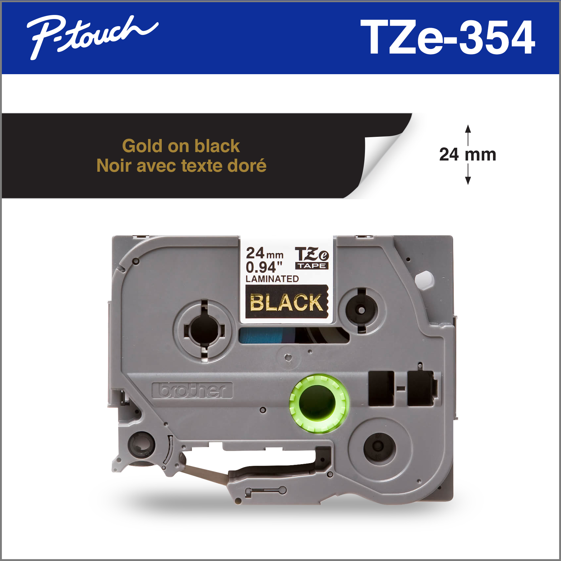 - Gold on black laminated TZe P-touch 24 mm label tape