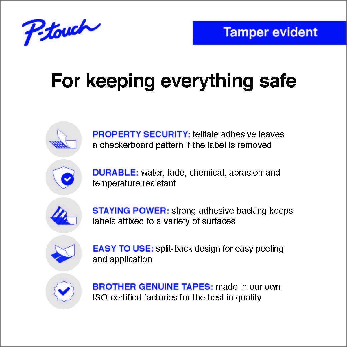 Brother Genuine TZe-SE4 black on white 18 mm security tape is designed for use with P-touch label makers and is perfect for property security labelling applications. Featuring our exclusive laminated tape process and a special telltale adhesive, this tape leaves behind a checkerboard pattern if the label is removed, making it obvious that someone has tampered with it.