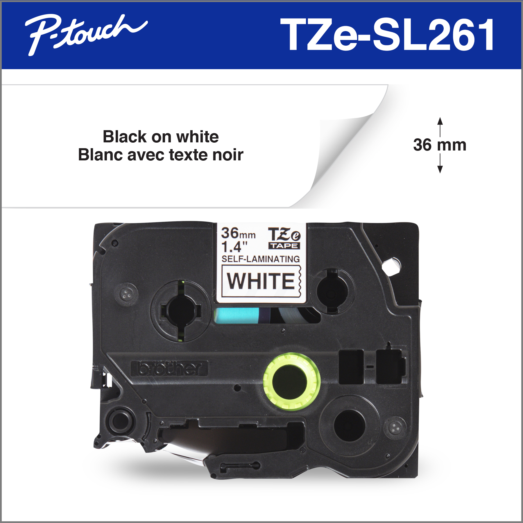 - Black on white self-laminating TZe 36 mm tape for use with Brother P-touch label makers