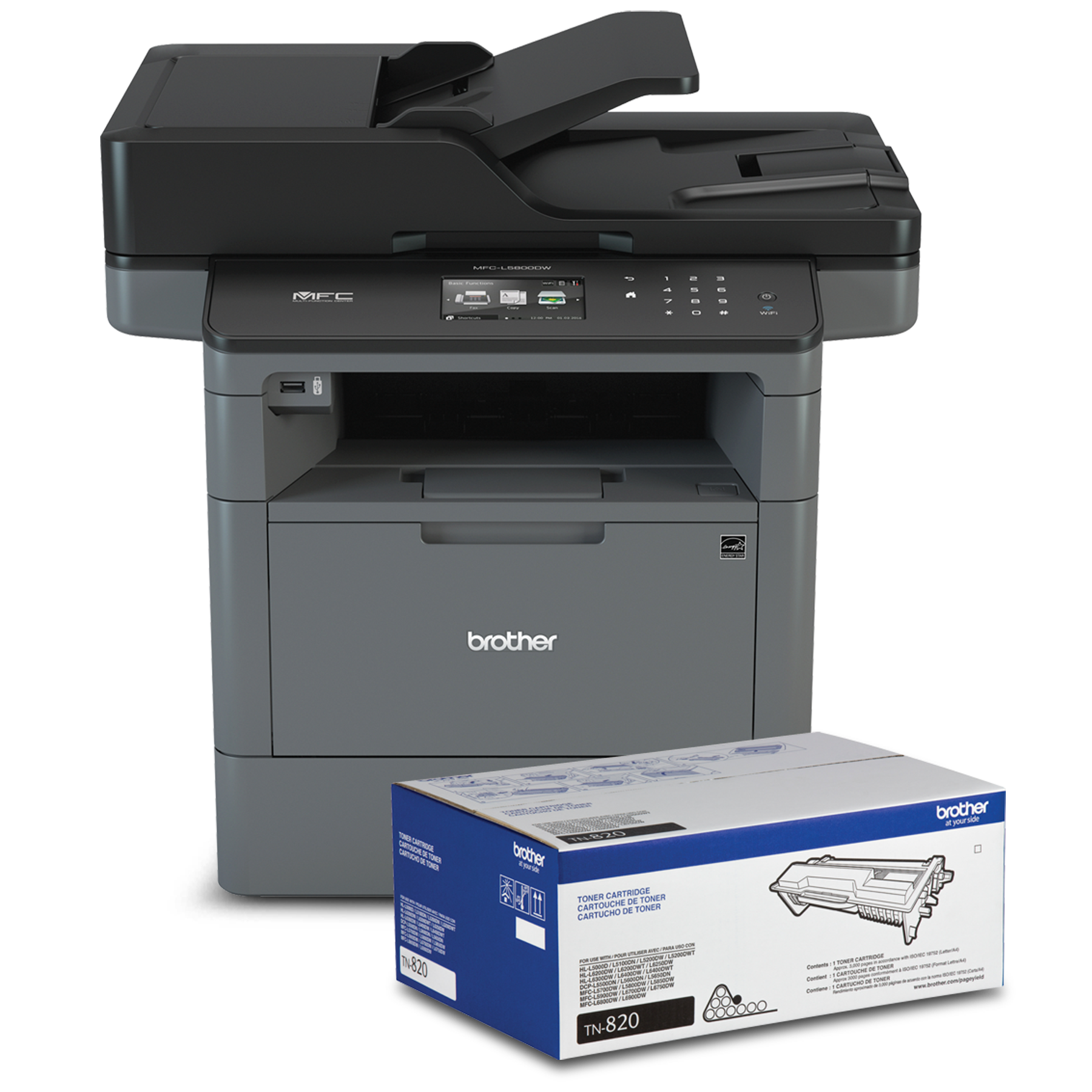 L'ensemble MFC-L5800DW de Brother inclut une imprimante multifonction laser monochrome d affaires et une cartouche de toner noir TN820, l idéal pour les bureaux et les petits groupes de travail recherchant des résultats rentables. Elle imprime et copie rapidement jusqu'à 42 ppm, et ses fonctions de sécurité avancées, telles que l'authentification des utilisateurs sur le réseau, contribuent à protéger contre l'accès non autorisé à l'appareil. Elle inclut une capacité papier de 250 pages, extensible jusqu à une capacité totale de 1 340 feuilles avec les bacs supplémentaires en option. Son chargeur automatique de documents d'une capacité de 70 pages permet de numériser jusqu'à 28 ipm (monochrome) et offre une numérisation couleur vers diverses destinations. Ce multifonction offre également l impression recto verso automatique et une connectivité Ethernet/sans fil. Vous pouvez imprimer depuis ou numériser vers les appareils mobiles sur un réseau sans fil, et son écran tactile couleur de 3,7 pouces facilite l'utilisation grâce à des raccourcis personnalisables.