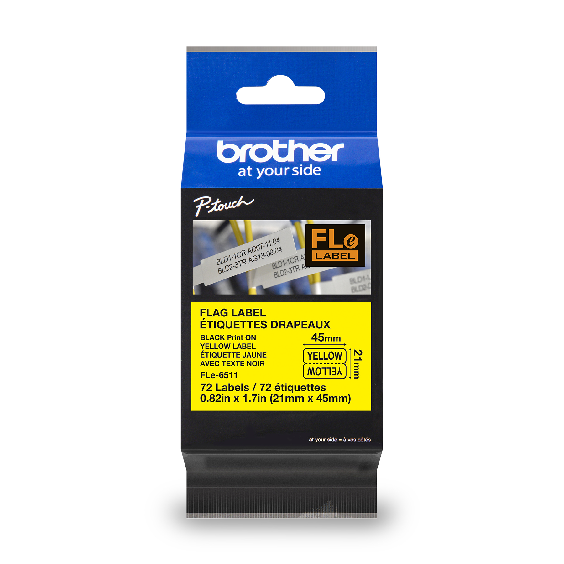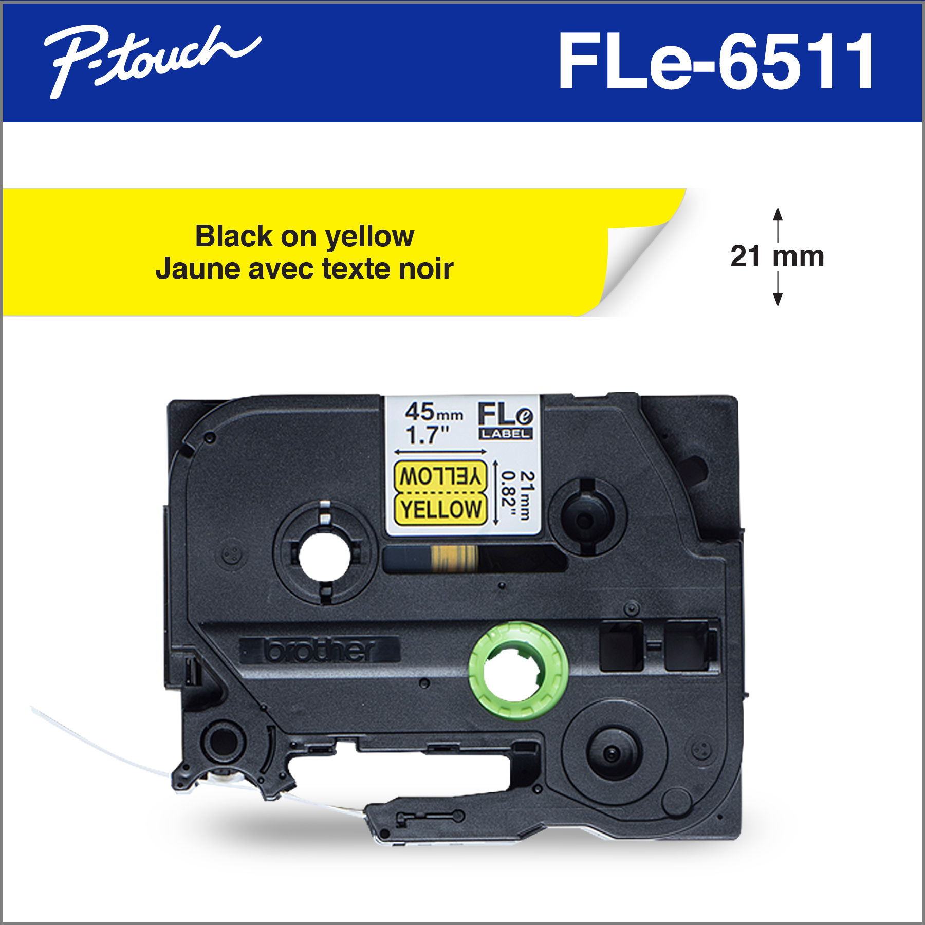 - Les étiquettes en polyester prédécoupées jaunes avec texte noir FLe2511 authentiques de Brother de 21 mm x 45 mm sont compatibles avec les étiqueteuses Brother P-touch dotées du logo FLe.