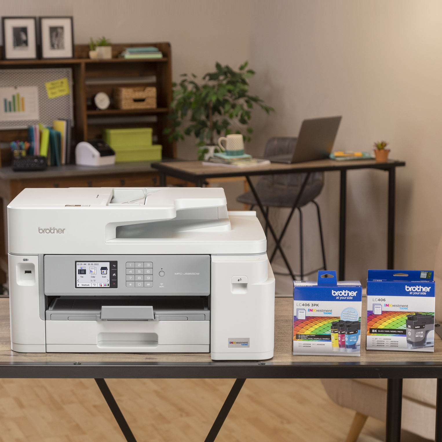 Fiable et économique, l imprimante tout-en-un à jet d'encre couleur INKvestment Tank MFC-J5855DW de Brother produit des documents de qualité professionnelle et comprend un an d encre dans la boîte. Que ce soit pour imprimer des documents personnels, des bulletins scolaires ou des présentations volumineuses, vous obtiendrez rapidement des images et du texte aux couleurs vives et nettes. Intégrant des options de connectivité flexibles (sans fil bibande 2,4 Ghz et 5 GHz, Wi-Fi Direct®, Ethernet, port USB), cet appareil permet d imprimer et de numériser où que vous soyez et quand vous le voulez au moyen de l appli Brother Mobile Connect. Ses fonctions d impression, de copie, de numérisation et de télécopie sont faciles à gérer à partir d un ordinateur, d un appareil mobile ou de l écran tactile couleur ACL de 3,5 po. Homologuée ENERGY STAR® et certifiée EPEAT®, le MFC-J5855DW comprend des fonctions écoresponsables comme le mode Économique et le mode Économie d encre pour réduire sa consommation d énergie et d encre. De plus, l impression recto verso est réglée par défaut pour vous faire économiser du papier et de l argent et vous aider à contribuer à la protection de la planète. Ayez l esprit tranquille grâce aux fonctions de sécurité à trois couches qui protègent les documents sensibles pendant l impression. Conçue pour durer et prête à l emploi, cette imprimante INKvestment Tank de Brother est le choix intelligent pour tout bureau à domicile et petites entreprises.