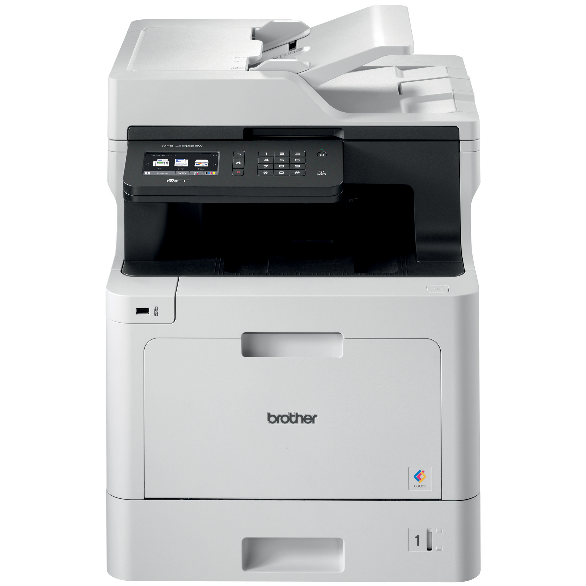 Avec des vitesses d'impression et de copie jusqu'à 33 ppm en couleur et noir et blanc et l'impression recto verso automatique, l'imprimante multifonction laser couleur MFC-L8610CDW de Brother est idéale pour les bureaux et les petits groupes de travail. Elle assure une impression rentable et de qualité professionnelle grâce aux cartouches de remplacement à haut rendement authentiques de Brother de 4 500 pages en noir et blanc et 4 000 pages en couleur (rendement approximatif conformément à la norme ISO/IEC 19798). Simplifiez vos opérations quotidiennes grâce à des fonctions flexibles de gestion du papier, telles qu'une capacité de 300 feuilles, extensible jusqu'à 1 050 feuilles avec des bacs en option et un chargeur automatique de documents d'une capacité de 50 pages pouvant numériser jusqu'à 29 ipm. Grâce à la connectivité Gigabit Ethernet/sans fil, elle peut imprimer/numériser vers des appareils mobiles via un réseau sans fil et numériser vers une variété de destinations. Son écran tactile couleur de 3,7 po vous permet de créer des raccourcis personnalisables et ses fonctions de sécurité avancées permettent l'authentification des utilisateurs sur le réseau et la restriction d'accès à l'appareil.