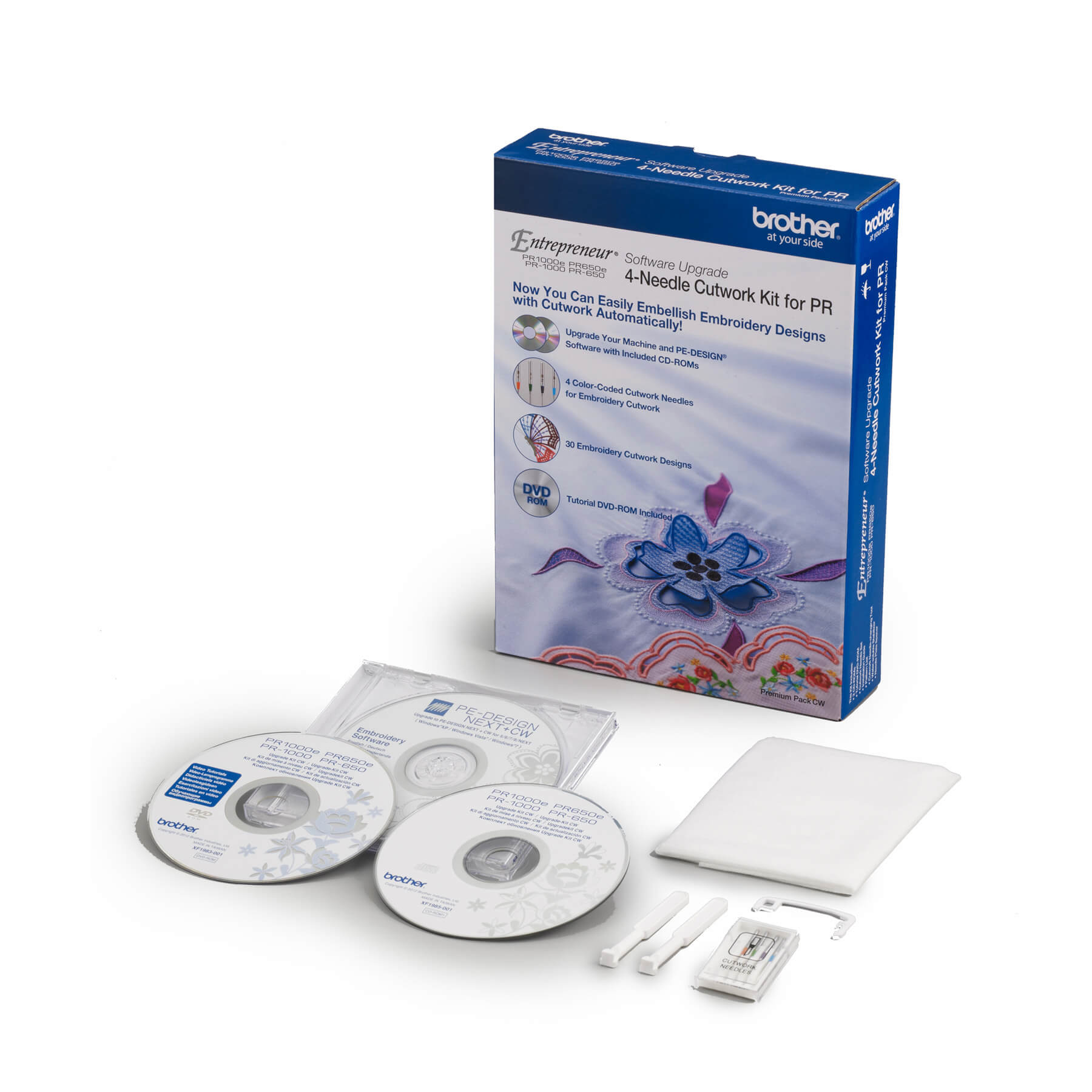 Élargissez les possibilités de broderie créatives de votre machine de la série PR650 ou PR1000 avec de nouvelles options de broderie blanche! Mettez à niveau votre machine de la série Entrepreneur PR et votre logiciel PE-DESIGN, vous donnant ainsi la possibilité de créer et de personnaliser de superbes projets de broderie blanche (cutwork). Avec cette trousse, vous pouvez configurer votre machine à broder multi-aiguilles à la fois pour broder ET couper, sans avoir à changer d'aiguille entre les deux. Utilisez les motifs inclus pour broder et couper de magnifiques appliqués, pièces et broderies blanches, ou utilisez le logiciel de conception de broderie PE-DESIGN® NEXT pour créer vos propres motifs de broderie blancs personnalisés! Les clients doivent posséder PE-DESIGN® version 5.0 ou supérieure afin de pouvoir utiliser toutes les fonctionnalités de cette trousse.