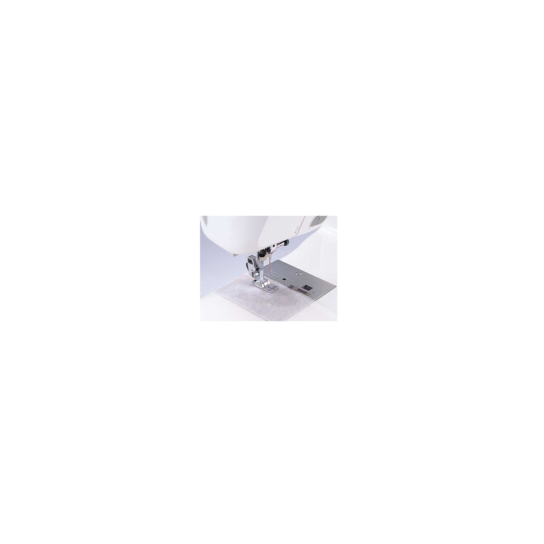 La conception de ce pied améliore le contact avec les griffes d'entraînement, permettant ainsi de profiter d'un entraînement plus précis et constant pour réaliser des points droits de meilleure qualité. Ce pied est également utilisé pour réaliser des points en utilisant des tissus fins et de moindre grammage avec lesquels une ouverture centrale plus importante du pied risquerait de déplacer le tissu à proximité de la bobine.