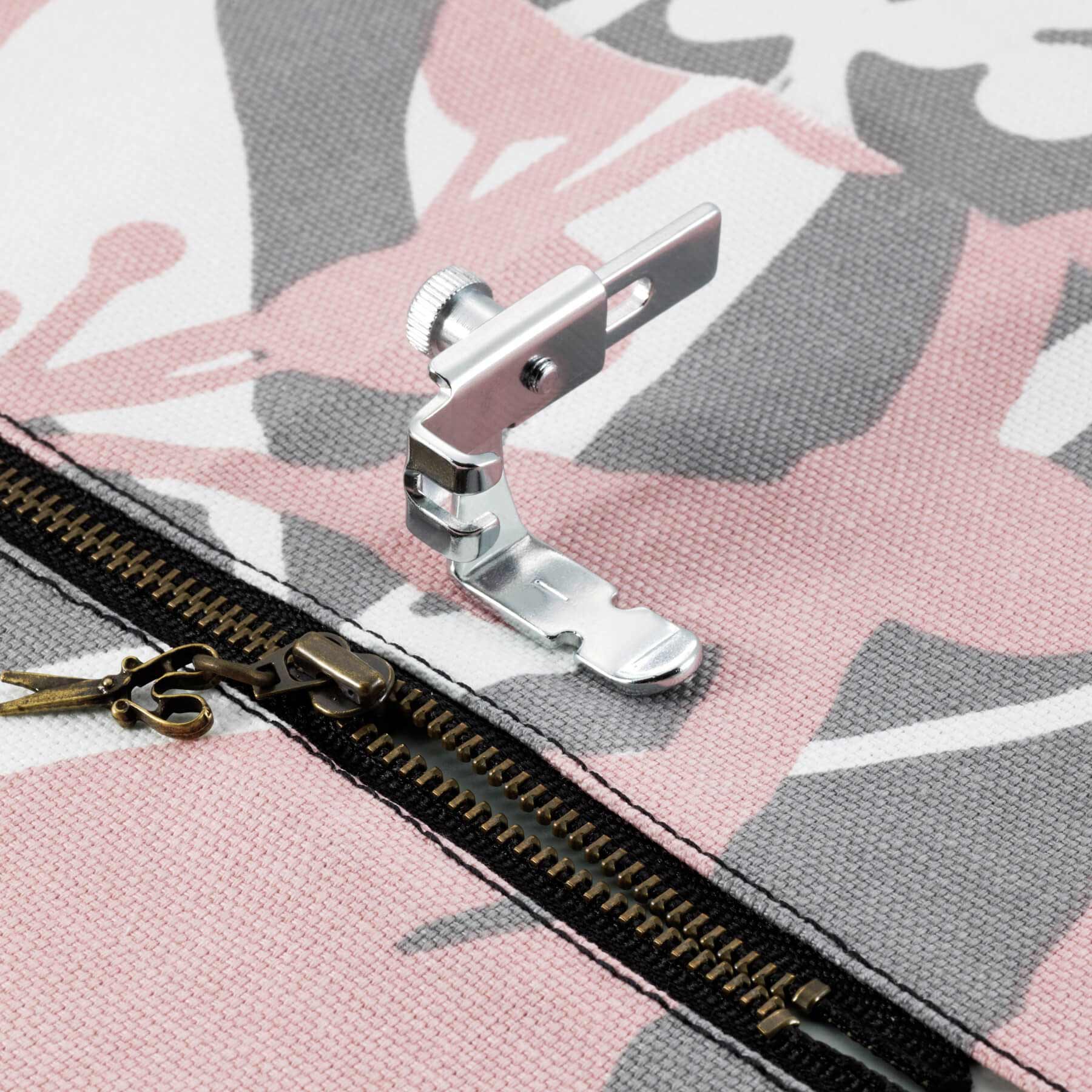 Ce pied réglable pour fermeture éclair/passepoil attache les fermetures à glissière et les passepoils facilement. Sa position peut être réglée exactement sur le bord de la fermeture à glissière ou du passepoil, en évitant leurs parties non planes. Il applique également une pression exacte sur le tissu. Il est réglable pour une couture à gauche ou à droite et il s'adapte aux différentes dimensions de passepoil. Ouverture à point unique pour la création précise et parfaite de points lancés. Nécessite l'adaptateur de tige basse pour les machines à coudre de série ULT, PC-6500, PC-8200 et PC-8500.