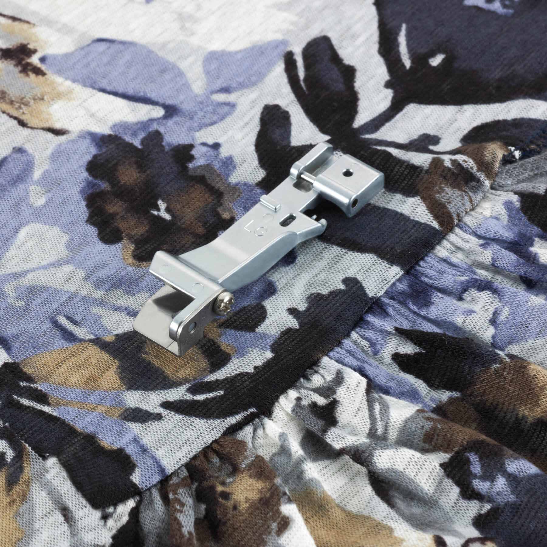 Froncez et finissez les bordures en une seule opération. Ourlez les bordures de tissus avec ce pied encliquetable. Le canal sur le pied fixe solidement le tissu, éliminant ainsi le besoin d'utiliser des épingles pendant que créez un ourlet ou que vous froncez des couches de tissus simples ou doubles. Permet de coudre des couches de tissus et de finir les bordures en une seule opération.