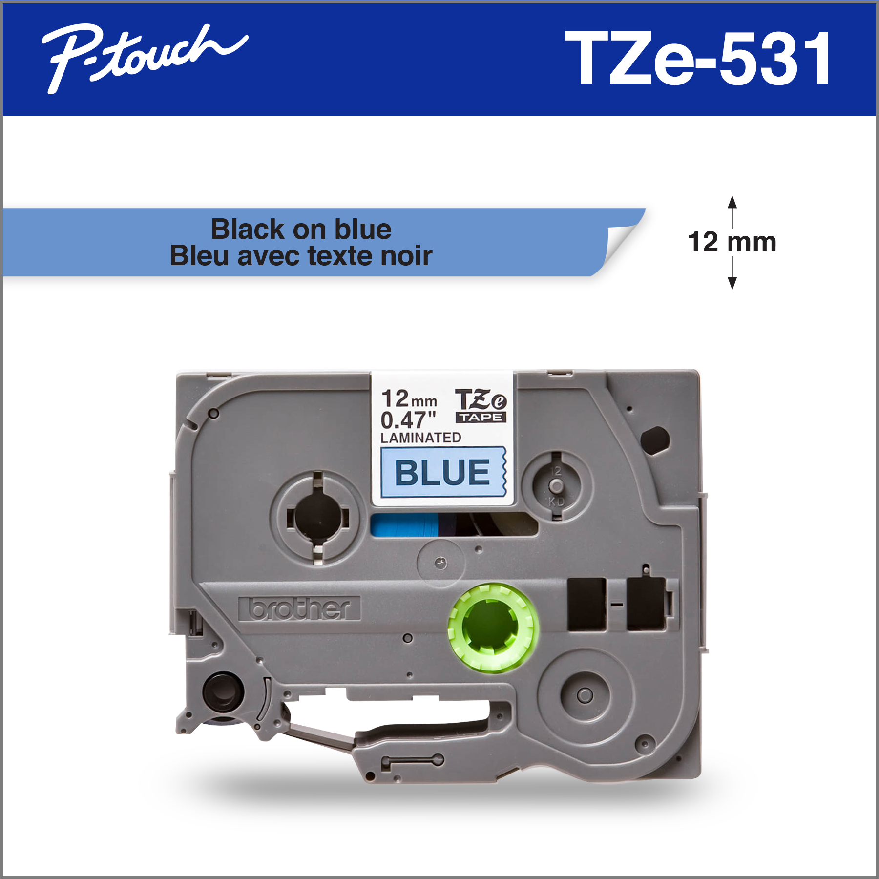 Brother TZe531 Ruban laminé bleu avec texte noir authentique pour étiqueteuses P-touch, 12 mm de largeur x 8 m de longueur