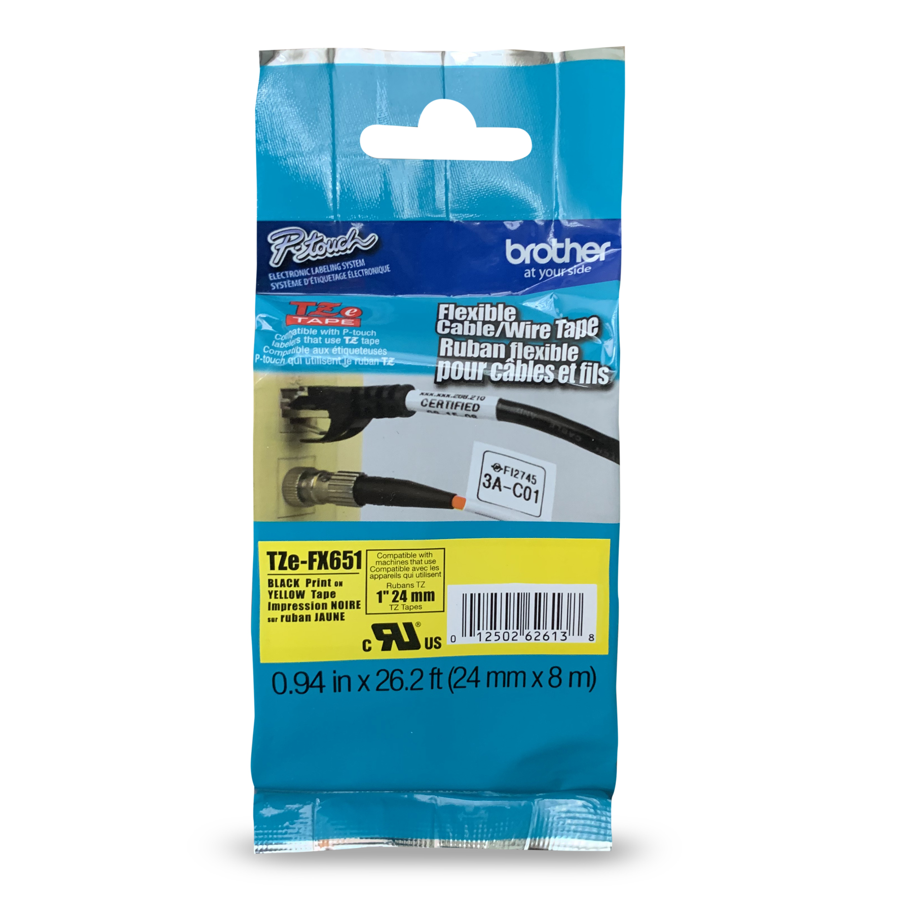 Le ruban d identification flexible et laminé jaune avec texte noir de 24 mm TZe-FX651 de Brother est compatible avec les étiqueteuses P-touch et convient parfaitement à une variété d utilisations. Avec son adhésif spécialement conçu qui colle sur lui-même, il est parfait pour étiqueter des surfaces cylindriques, comme des câbles, des fils et des tuyaux de PVC, ce qui en fait un excellent choix pour l étiquetage et l identification des fils, entre autres.