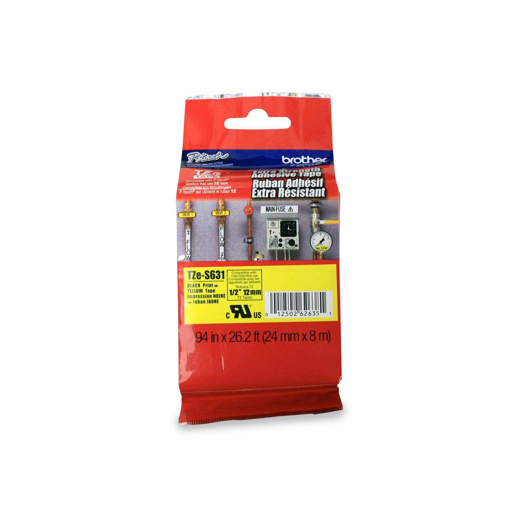 Brother TZe-S631 Ruban adhésif très résistant jaune avec texte noir authentique pour étiqueteuses P-touch, 12 mm de largeur x 8 m de longueur