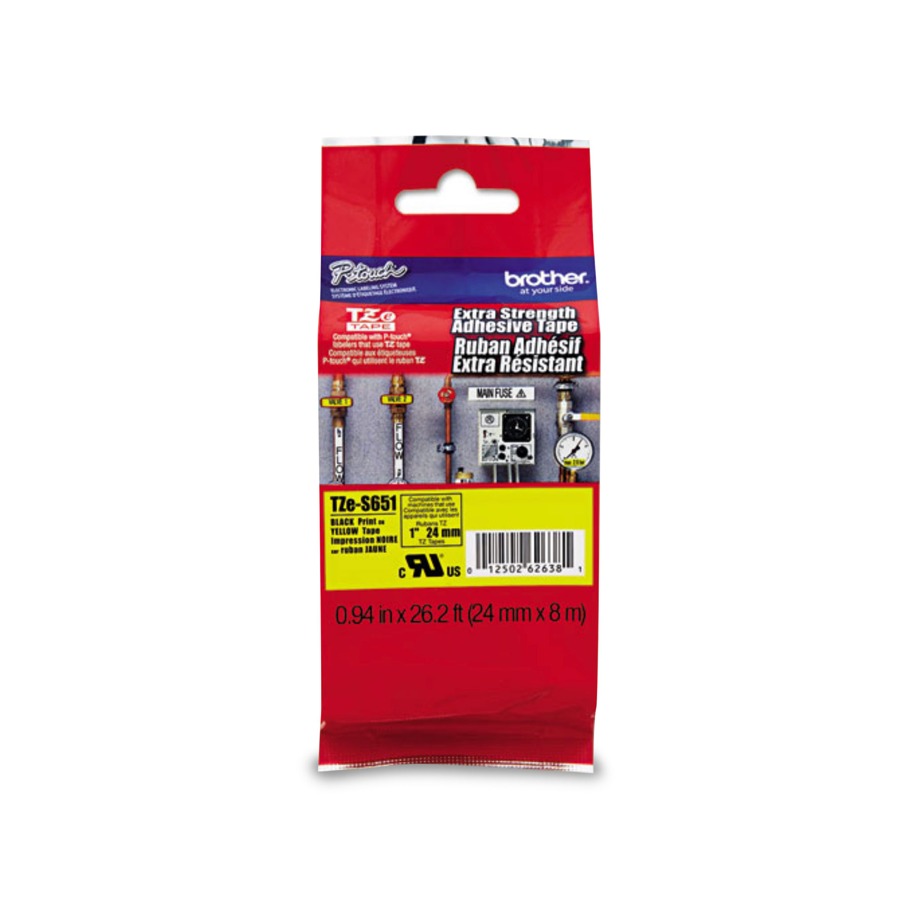 Brother TZe-S651 Ruban adhésif très résistant jaune avec texte noir authentique pour étiqueteuses P-touch, 24 mm de largeur x 8 m de longueur